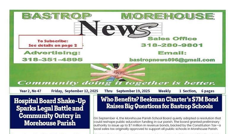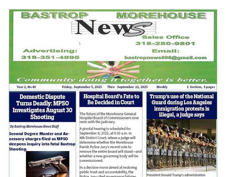 Bastrop Morehouse News continues to be one of the most popular local news paper sources for the Bastrop area. Our news paper is dedicated to informing and connecting the community through timely stories, well-researched articles, and thoughtful opinion pieces. We believe that a news paper should do more than report events. It should also foster unity and understanding among people. Our news paper brings you local highlights, features on community leaders, and comprehensive coverage of what matters most to our readers. We proudly serve the Bastrop area, making sure our news paper remains at the center of daily life for our neighbors. With engaging content, trusted journalism, and a commitment to the slogan "Community doing it together is better", it is easy to see why our news paper stands out and enjoys strong community support. We strive to ensure that our news paper provides a platform for diverse voices and stories. Contact us today if you want to get involved or learn more about what makes our news paper a beloved staple in the community.